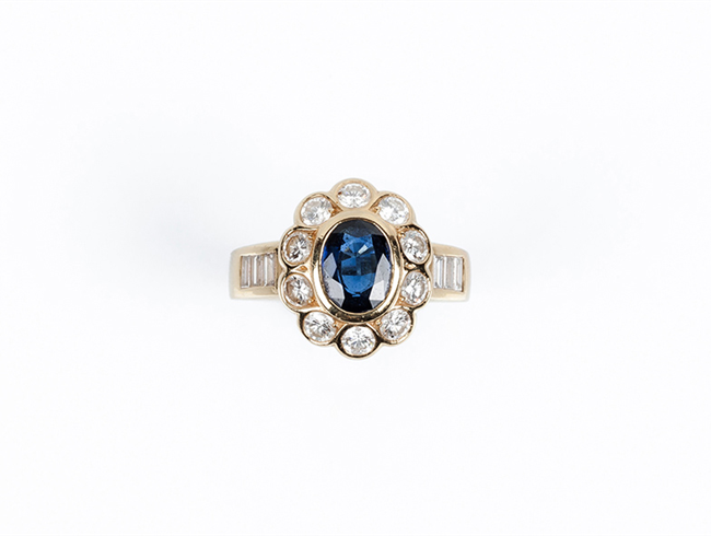 Sortija en oro amarillo 18 K con zafiro fino azul, oval, en chatón, y orla en fila de limpios y blancos diamantes, talla brillante y bandas de diamantes baguette en los hombros (1 zaf: 2.50 ct aprox y 10 btes: 0.80 ct y 6 bag.: 0.36 ct aprox., características estimadas: color G-H, pureza VS). Nº anillero: 14 (con adaptador interior).