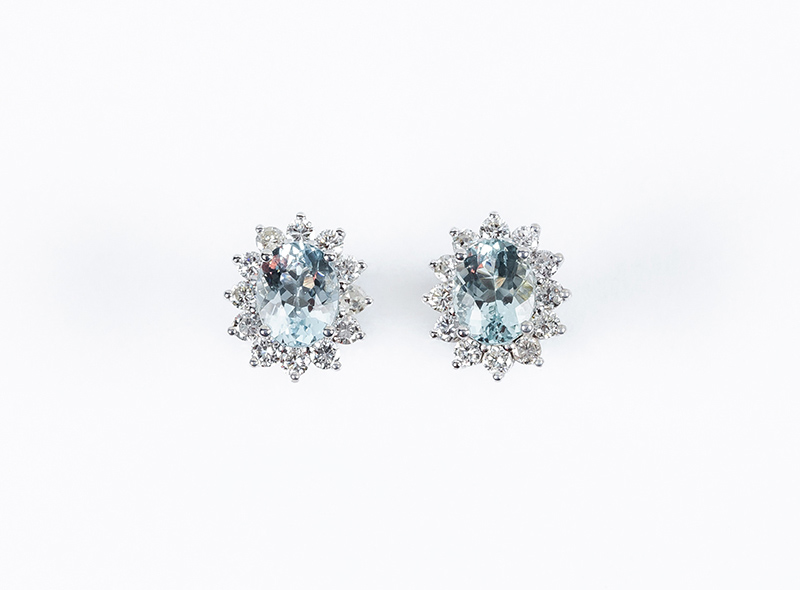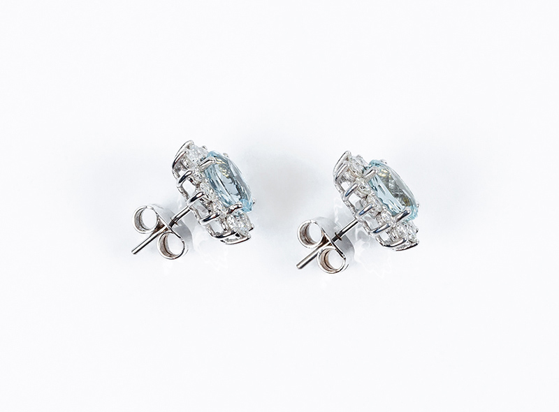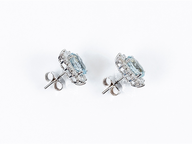 Pendientes en oro blanco 18 K, con una bonita aguamarina, talla oval, orlada de limpios y blancos diamantes, talla brillante (2 Agua: 3.90 ct aprox; 24 bts: 1.40 ct aprox., características estimadas: color G, pureza VS). Sistema de presión. 15 x 12 mm.