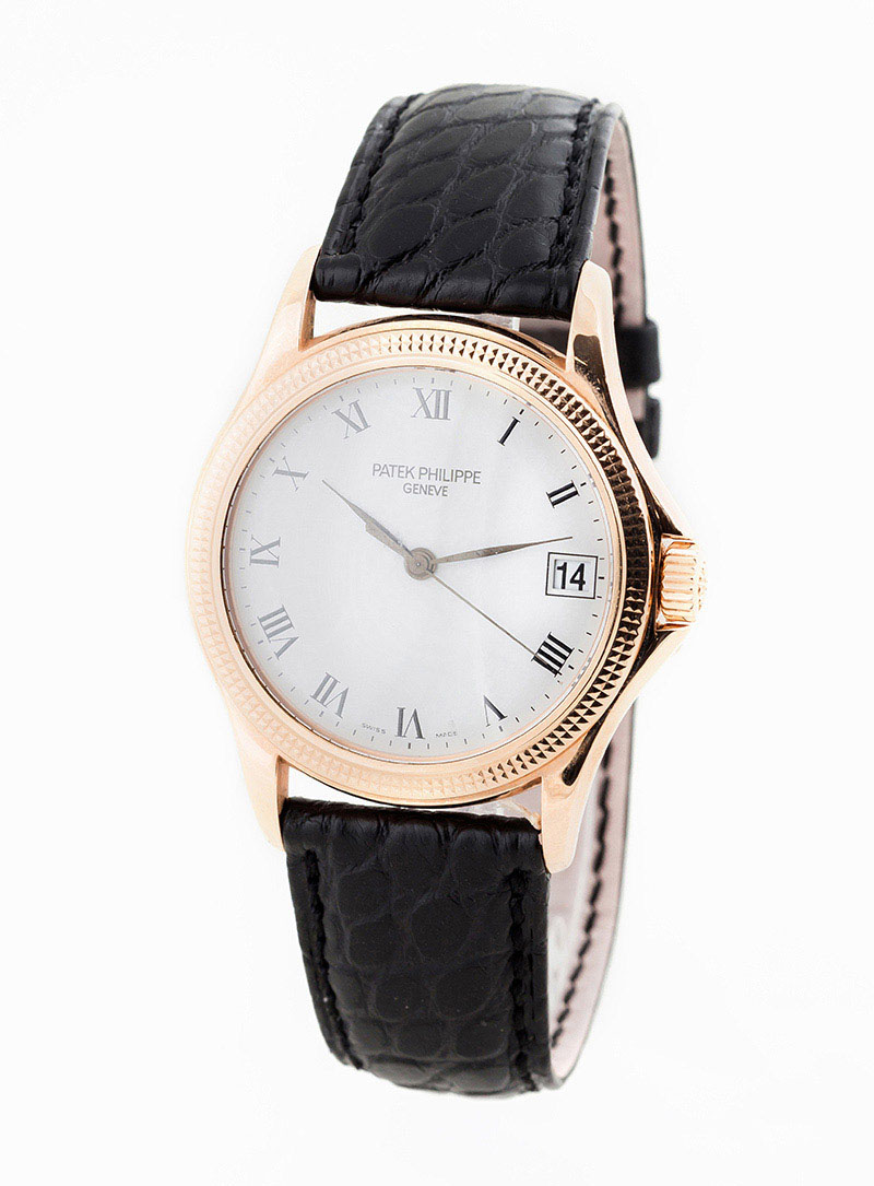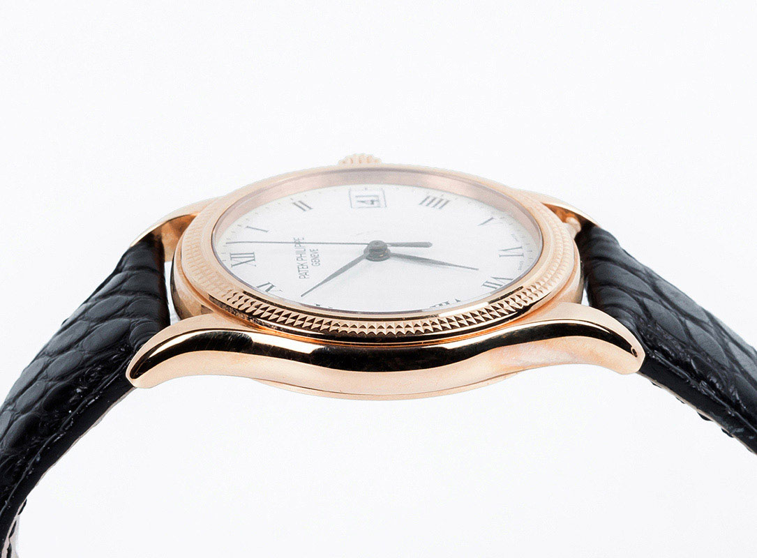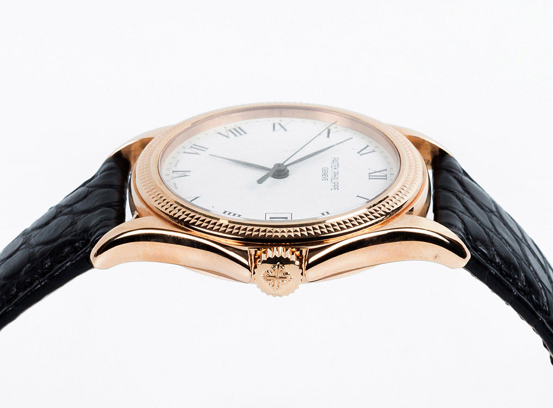 Reloj cab., suizo, PATEK PHILIPPE Calatrava, Ref 5117R-001. Sólida caja 37 mm en oro rosa 18 K con bisel ajedrezado "Clous de Paris" y cristal zafiro en anverso y reverso. Corona roscada. Esfera blanca con numerales romanos y agujas negras, segundero central. Calendario a las tres. Movimiento automático (calibre 315/190 SC aut). 30 rubíes, masa oscilante en oro amarillo 18 K decorada con el logo del modelo, ajustado a temperaturas y posiciones. Brazalete de cocodrilo negro y hebilla en oro rosa 18 K, originales. Impecable (0). Se acompaña Certificado de origen (2008). Estado de marcha. Se acompaña de un estuche Patek (de época anterior).