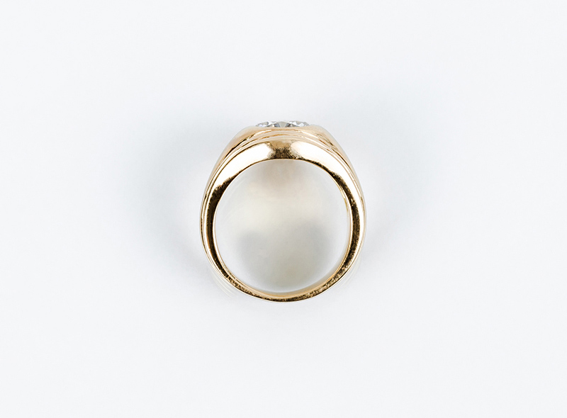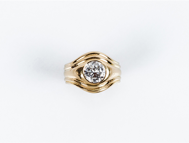 Anillo solitario en sólida montura gallonada de oro amarillo 18 K, con un limpio y blanco diamante natural, talla brillante moderna, de 1.40 ct aprox. (características estimadas: color H, pureza VVS, Muy buena talla, pulido y simetría. No fluor.), en chatón. Nº anillero: 9-10.