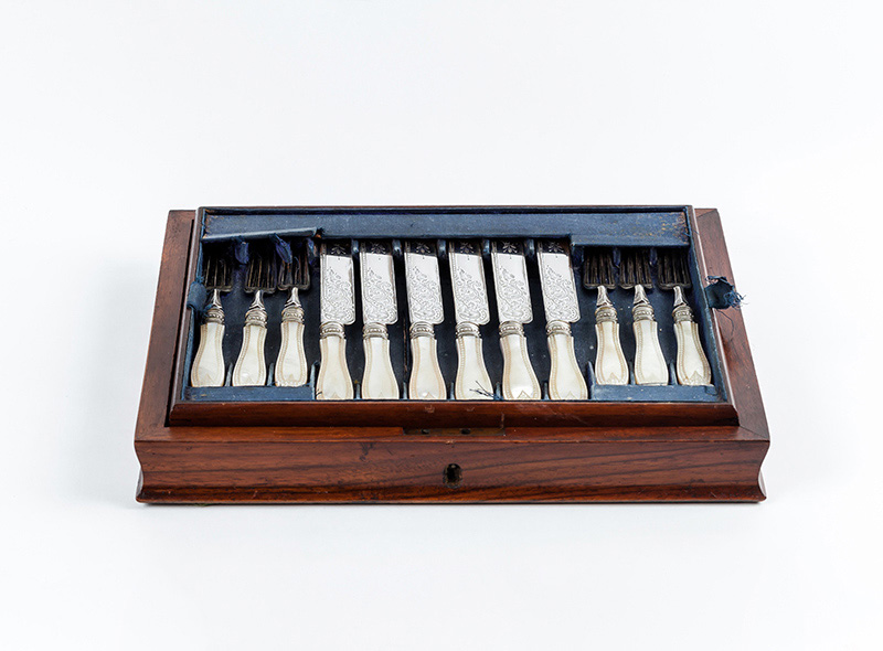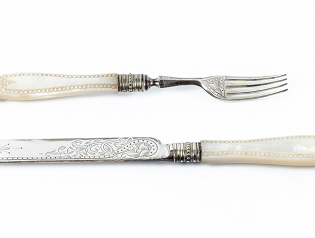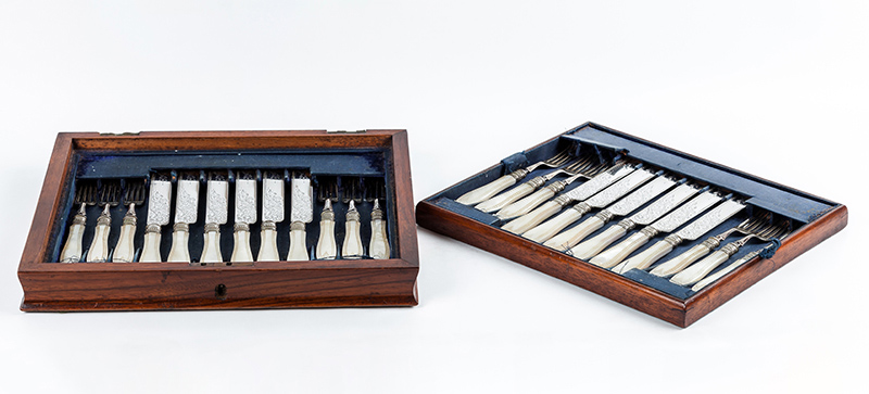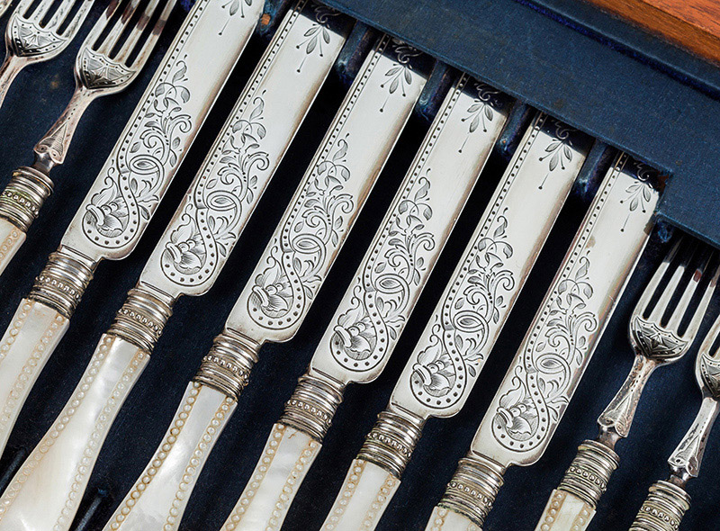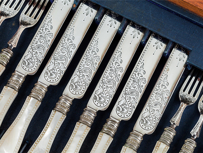 Bello juego vintage de doce cuchillos y tenedores en plata inglesa contrastada (Sheffield, 1873), con decoración floral grabada y asas de nácar. Se presenta en caja original de madera (deteriorada). 16,5 y 20,5 cm.