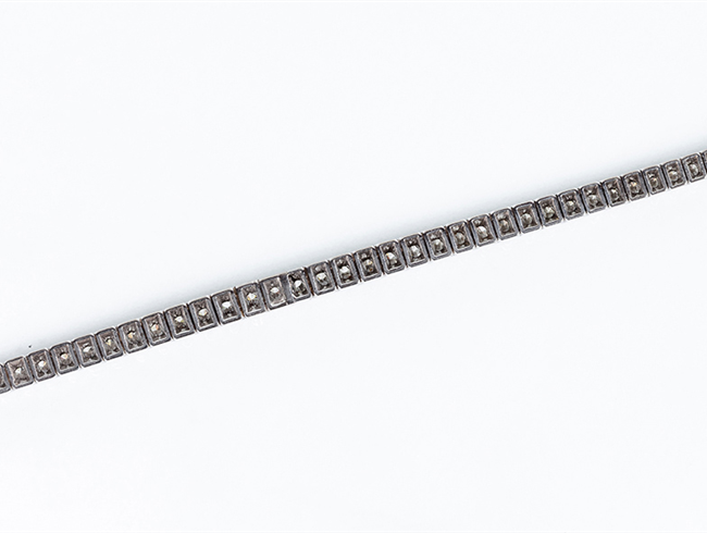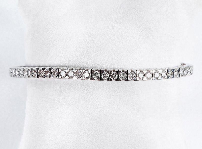 Brazalete riviere en sólida montura de oro blanco 18 K, con motivo articulado en fila de limpios y blancos diamantes, talla brillante en garras (58 bts: 2.00 ct aprox., características estimadas: color G, pureza VS). Cierre con dos posiciones y sistema de seguridad. 20,5-21,0 cm.