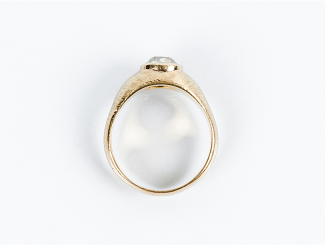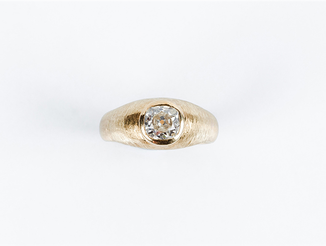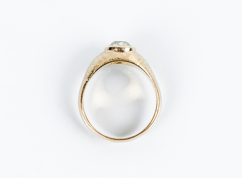 Anillo solitario vintage en sólida montura matizada de oro amarillo 18 K, con un limpio y blanco diamante natural, talla 'cushion', en chatón (1 dte: 1.75 ct aprox., características estimadas: color I, pureza VVS, fluorescencia media, azul). Anillero nº 23.