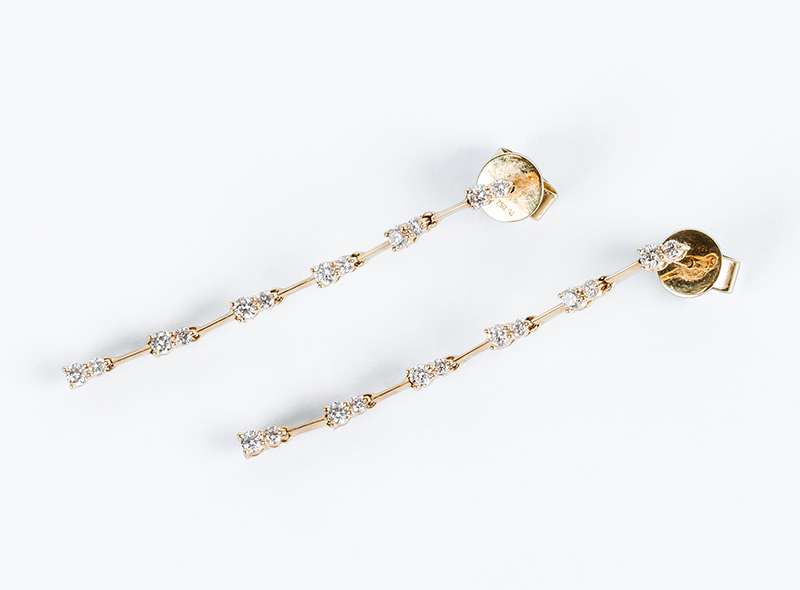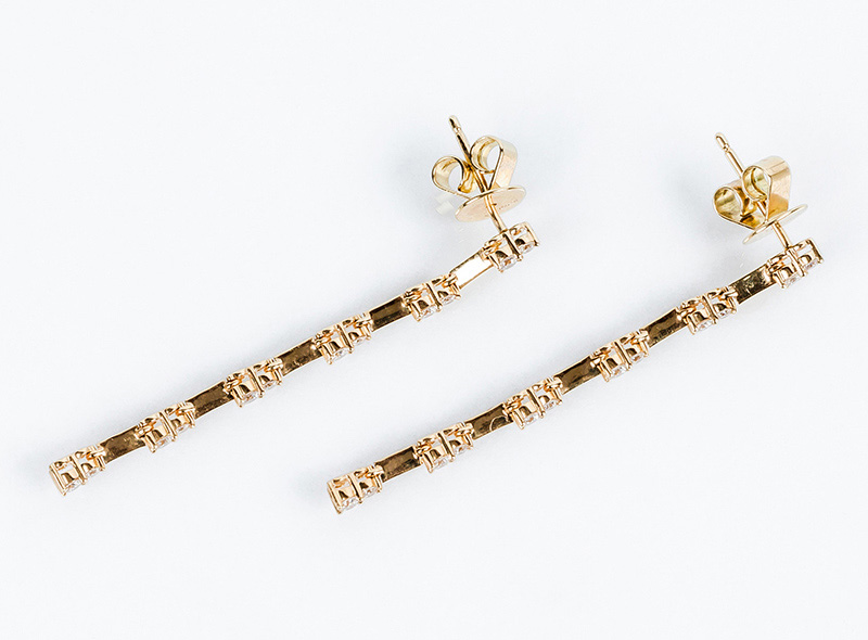 Pendientes largos en oro amarillo 18 K, en fila articulada con pares de limpios y blancos diamantes, talla brillante (24 bts: 0.52 ct aprox. Características estimadas: color G, pureza VS). Sistema de presión. 42 mm. A estrenar.