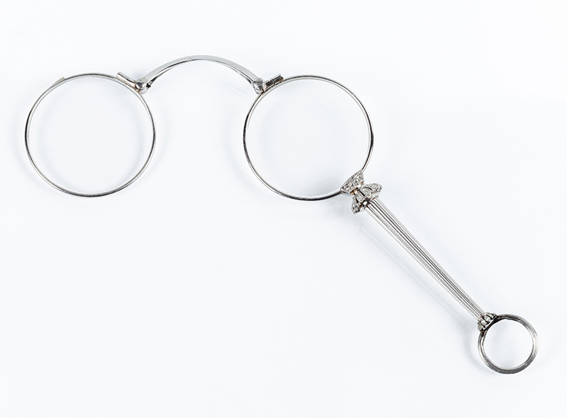 Delicados anteojos de ópera en platino y diamantes con mecanismo de apertura automática. Decoración estriada. Finales s. XIX - ppios. S. XX. 10,0 cm.