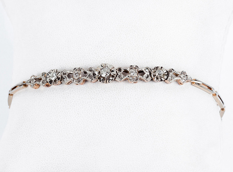 Pulserita antigua en delicada montura de oro rosa 18 K con vistas grafiladas de platino y tres centros de diamantes, talla 'cojín', en garritas de ilusión, sobre motivo geométrico calado decorado con diamantitos talla 8/8 y simple (3 bts: 0.22 ct aprox., y 28 dts: 0.20 ct aprox., características estimadas: color H-I, pureza VS-SI). Cierre y cadenita de seguridad. 19,4 cm.
