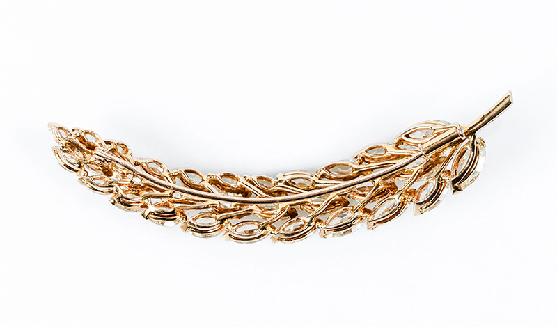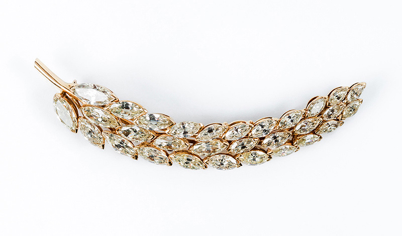 Elegante broche-alfiler de alta joyería en oro amarillo 18 K, diseño de espiga cuajada de limpios y grandes diamantes, talla marquisse, en garras (30 dts: 10.65 ct aprox. Características estimadas: color 'yellow very light', pureza VS). 80 mm.
