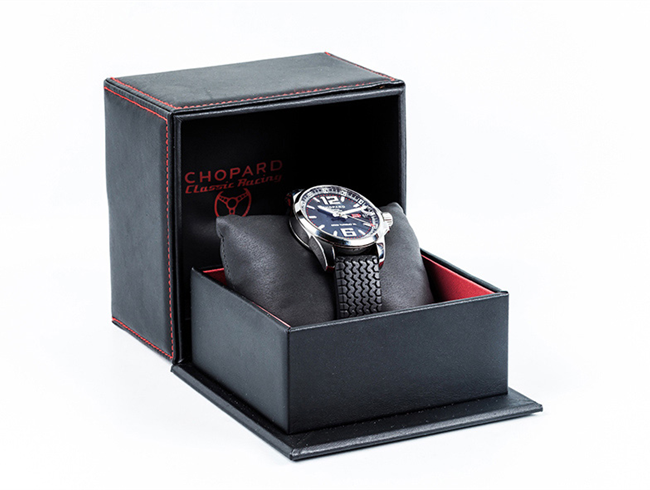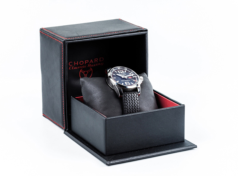 Reloj suizo caballero CHOPARD, 'Mille Miglia GT XL', 'Gran Turismo XL'. Cronómetro Oficial certificado. Ref.: 168997-3001, en sólida caja 44 mm, con fondo de cristal. Movimiento automático 24 rubíes, 5 posiciones de ajuste. Estanco a 100 m. Corona roscada. Esfera negra matizada con numerales, baquetones, agujas luminiscentes. Calendario a las tres. Brazalete ajustable de caucho -textura 'neumático'- con cierre desplegable originales. Excelente condición (0). Estado de marcha. Se acompaña de certificado de garantía Chopard (2017), manual, estuche y sobre-caja originales.