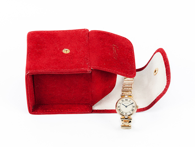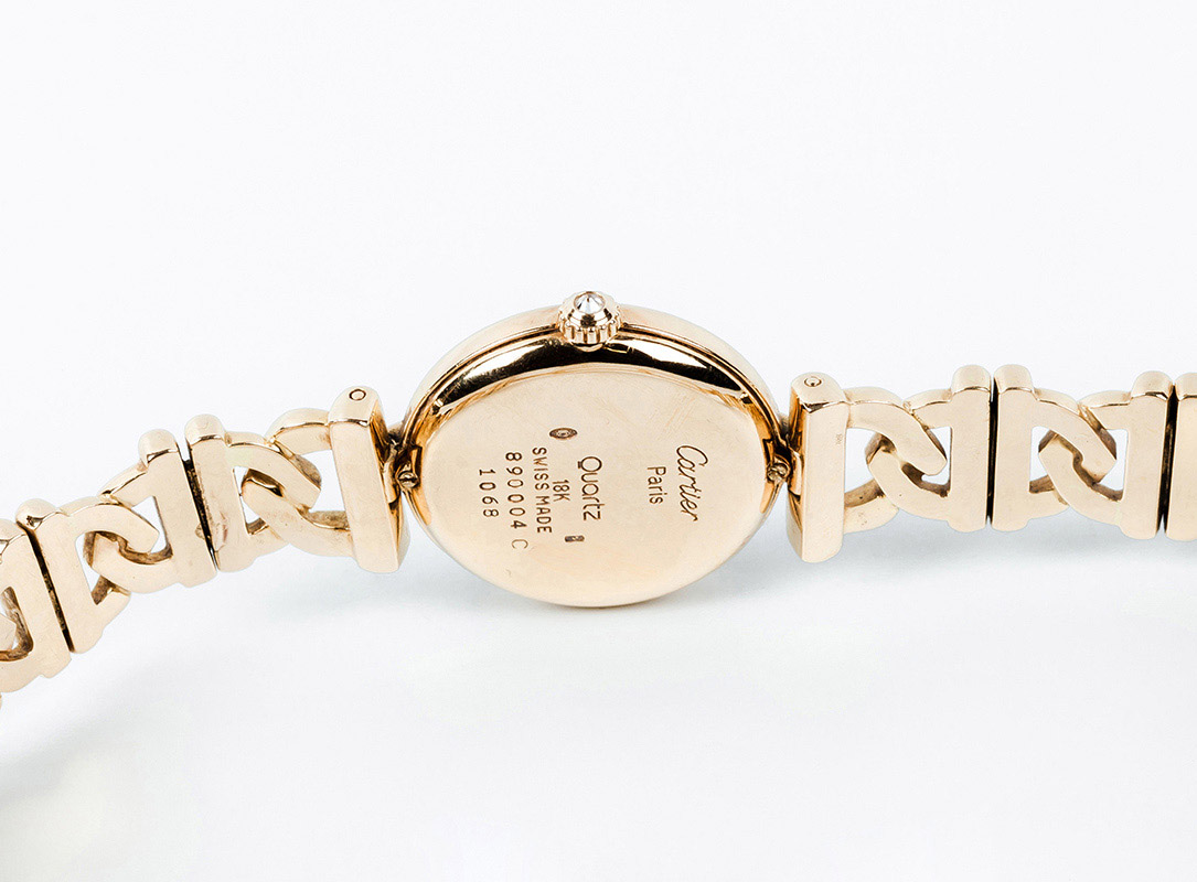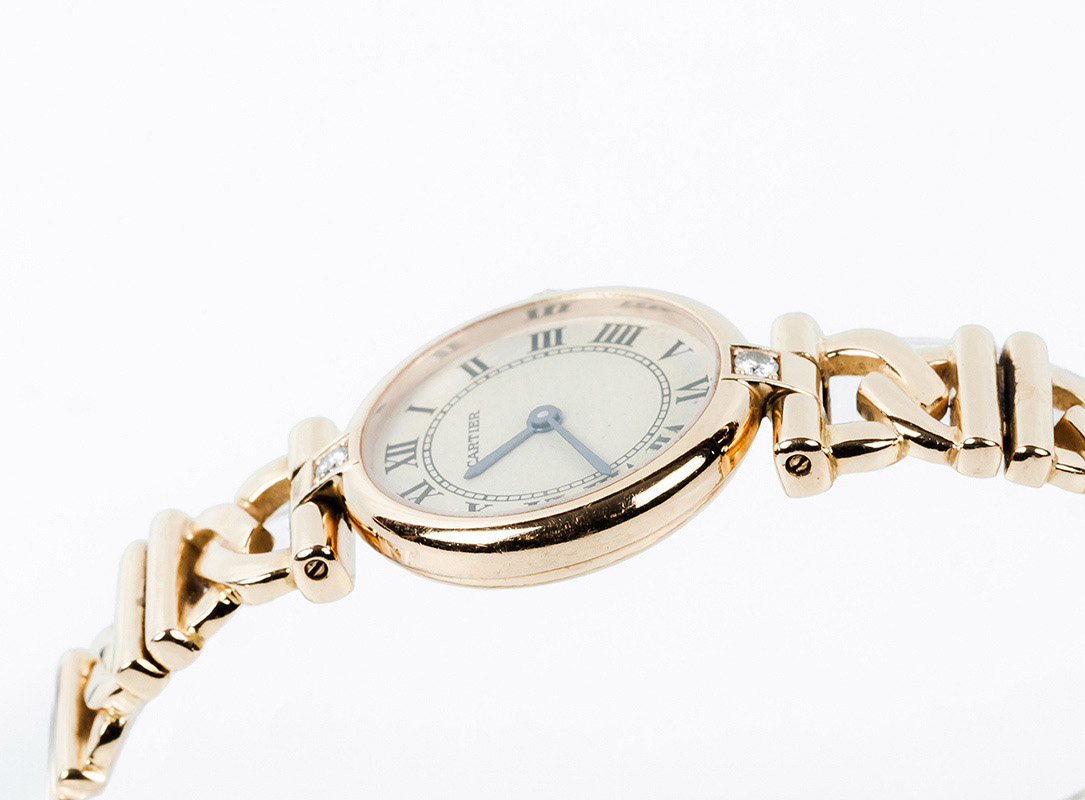 Reloj sra., suizo, CARTIER Vendôme, ref. 1068, en caja circular, 28 mm, decorada con un limpio y blanco diamante, talla brillante, sobre las 12 y otro bajo las 6, en chatón cuadrado, y brazalete articulado con cierre desplegable, todo en en oro amarillo 18 K. Corona engastada con un diamante invertido. Movimiento de cuarzo. Esfera crema con numerales romanos y agujas negras. Excelente condición (0-1). Estado de marcha. 17,3 cm. Con certificado de garantía 1994 y funda-estuche de piel y terciopelo.