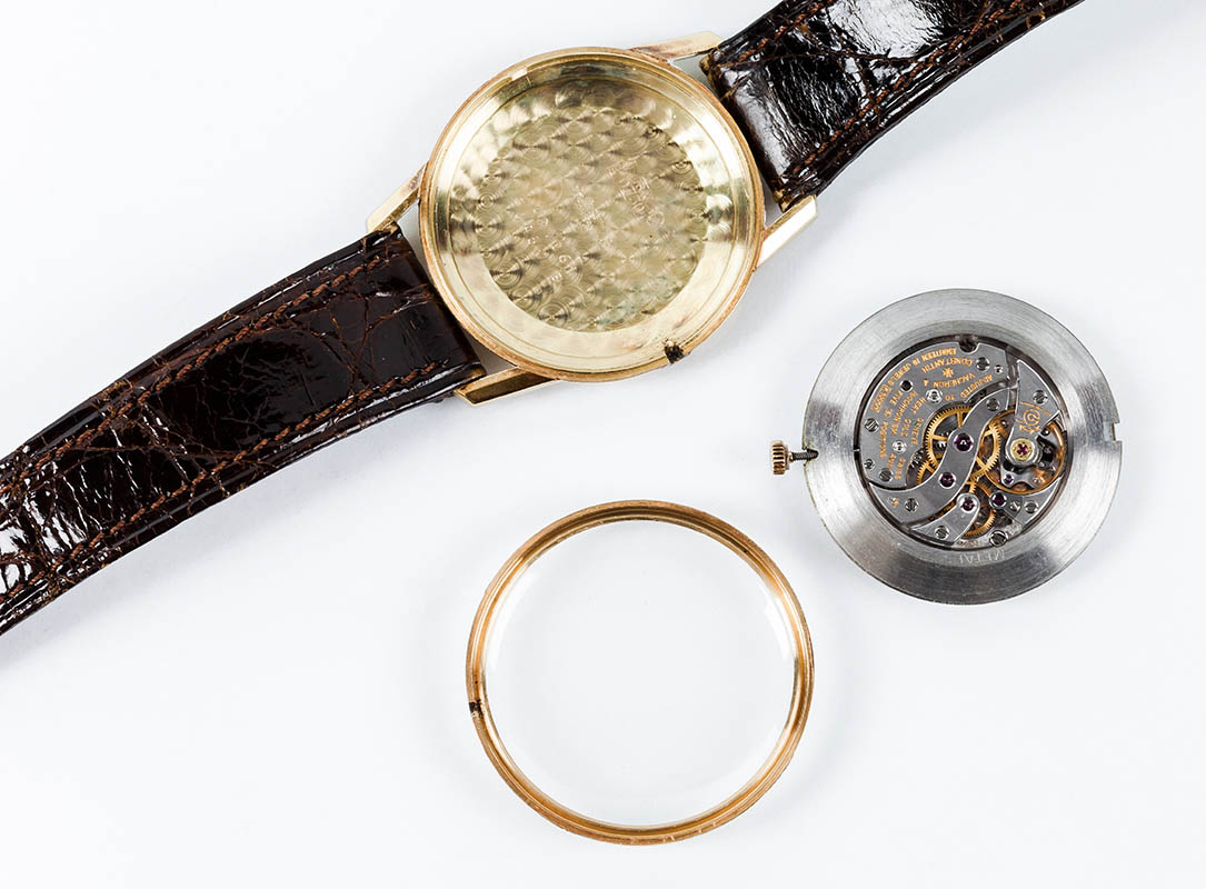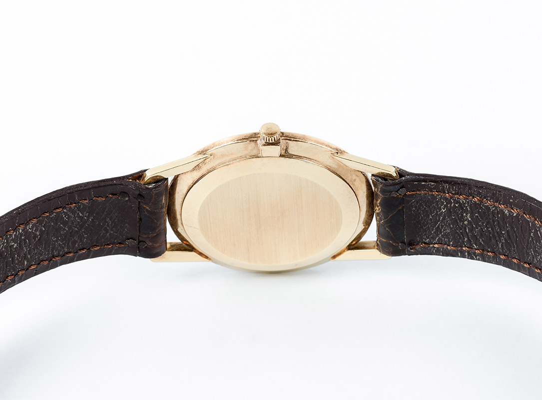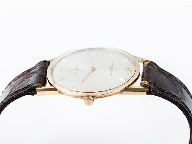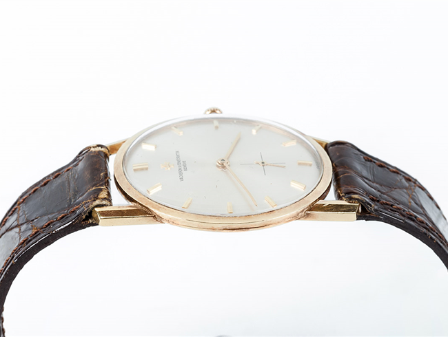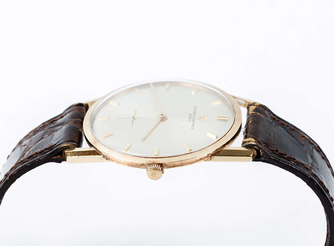 Reloj vintage suizo, caballero, VACHERON CONSTANTIN, dress watch ref.: 6456 B, en caja circular de origen, 34 mm, en oro amarillo 18 K, extraplana. Movimiento mecánico de carga manual calibre K1001/1 [Fabricado en colaboración con Jaeger-LeCoultre y refinada por Vacheron], nº 592550, con el punzón de Ginebra en el puente. 18 Rubíes, 5 posiciones de ajuste. Esfera plateada con baquetones y agujas doradas. Segundero a las seis. Brazalete de cocodrilo con hebilla de oro amarillo 18 K. C 1960. Excelente condición (1). Estado de marcha.