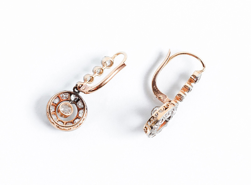 Bellos pendientes largos, antiguos, en oro rosa 18 K y limpios y blancos diamantes, talla brillante y 8/8 antigua, formando una fila de, en disminución, y motivo en movimiento, en aro calado con centro colgante (50 bts y dts: 1.80 ct aprox., características estimadas: color G-H, pureza VS-SI). Sistema de zarcillo con muelle.. 26 mm.Se acompaña estuche antiguo en piel azul, seda y terciopelo.