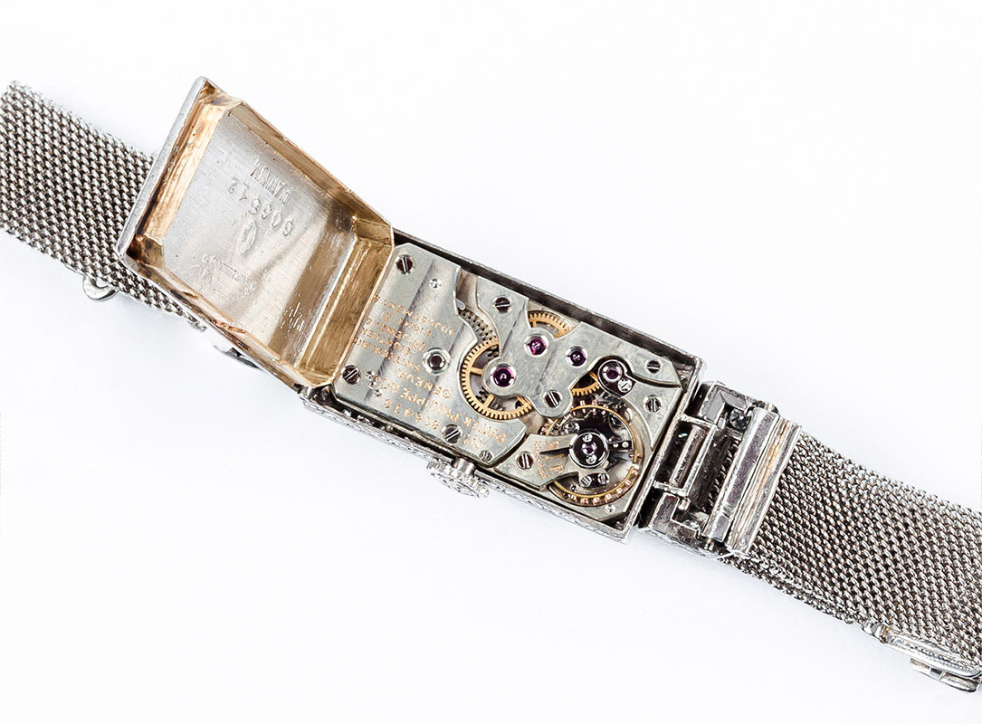Reloj-joya de sra., 'art-decó' PATEK PHILIPPE en caja rectangular de platino, 24 x 13 mm., con dos eslabones articulados, con frente cuajado de diamantes 8/8 (66 dtes: 1.00 ct aprox.). Esfera con numerales árabes. Movimiento mecánico de carga manual. Brazalete en malla fina de platino, regulable. Estado de marcha. Excelente condición.