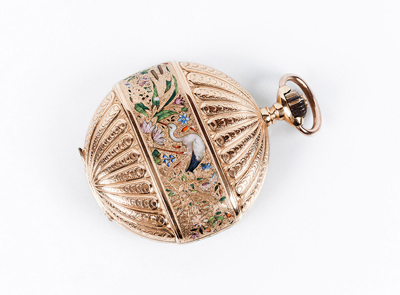 Reloj saboneta de bolsillo, suizo, LONGINES, en una bella caja de origen, 53 mm, de tres fuertes tapas, en oro amarillo 18 K, las principales en relieves de concha con una franja central profusamente ornada con delicados motivos animales y vegetales en policromía esmaltada, Nº 515491, y la guardapolvos con el lema de Grand Prix 1889 para la firma y las características del movimiento: áncora, 18 rubíes, en orla grabada. Excelente movimiento remontoir con volante bi-metal compensado, rubíes. Esfera de porcelana blanca con numeración romana negra y agujas 'espada' en acero azul. Segundero a las seis. C. 1895. Impecable condición (0-1). Estado de marcha. [Esta pieza pertenece al período de oro de Longines tras su éxito en la Exposición Universal de París 1889 (Grand Prix), donde Ernest Francillon posicionó la marca como referente en cronometría de precisión y alta complicación. Los relojes con decoración esmaltada policroma y naturalista eran encargos especiales para clientes adinerados