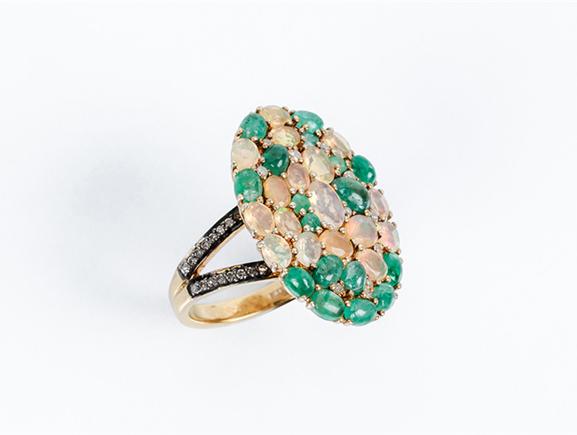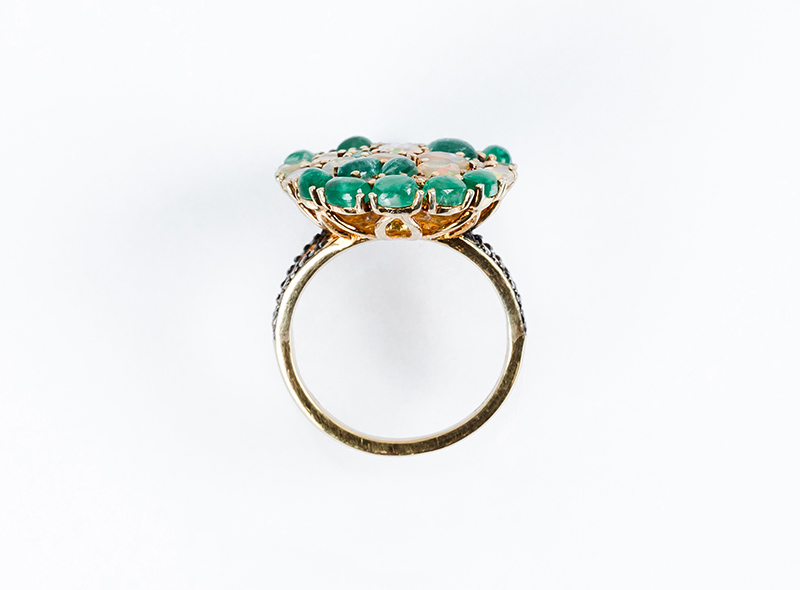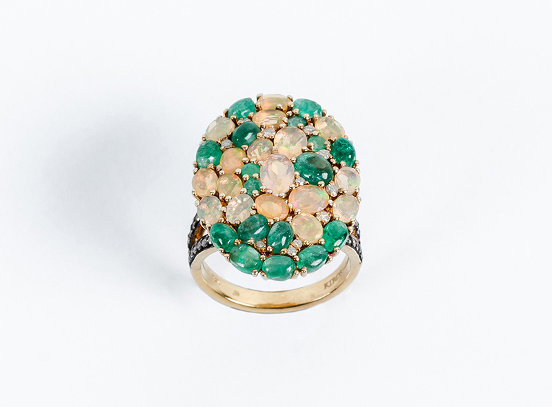 Bella sortija lanzadera en oro amarillo 18 K, con motivo oval cuajado en pavé de esmeraldas naturales y ópalos, talla oval y en cabuchón, salteados con blancos diamantitos talla 8/8, en vistas de plata sobredorada. Hombros decorados en filas de diamantitos sobre vistas pavonadas (32 Esm y op: 5.22 ct y 41 dts: 0.32 ct, características estimadas: color H-K, pureza I). Anillero nº 14-15.