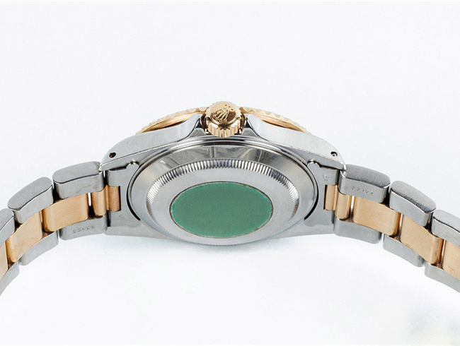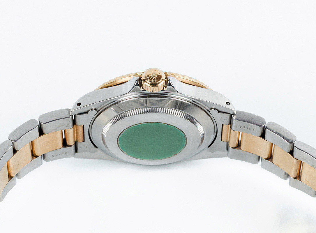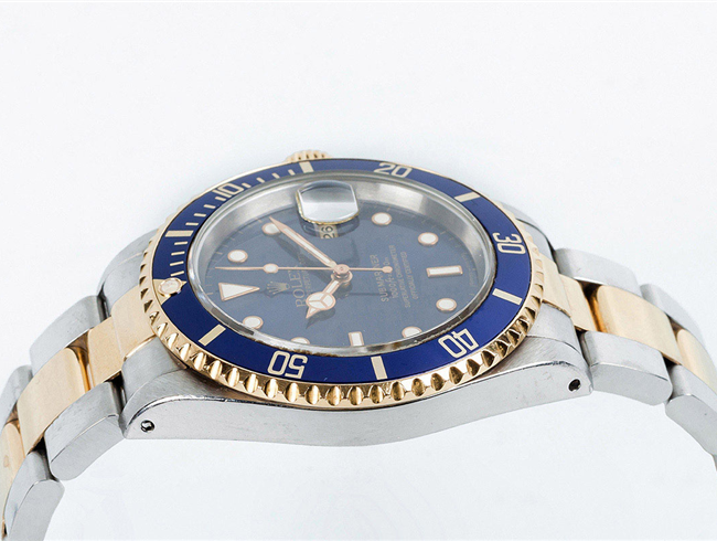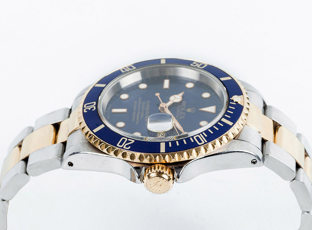 Reloj cab., suizo ROLEX Oyster Perpetual Date Submariner, 1000 m/300 ft, cronómetro oficial certificado, ref 16800. Caja 40 mm, con bisel azul con punto de tritio, y brazalete de acero y oro original 'President'. Movimiento automático. Esfera azul con puntos, baquetones y agujas dorados y luminiscentes, segundero central. Calendario a las tres, con lupa. C 2004. Muy buena condición (1-2). Estado de marcha.