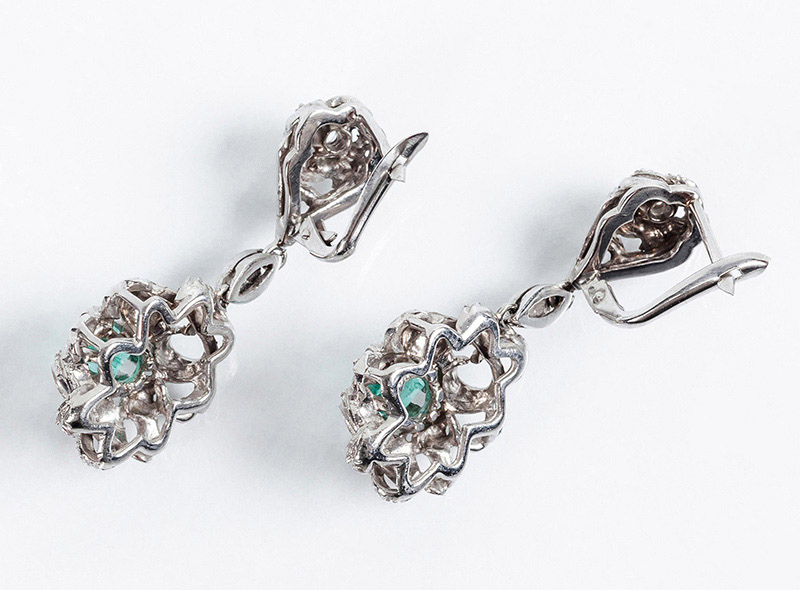 Pendientes antiguos, largos, en oro blanco 18 K, formados por dos cuerpos calados, en movimiento: un limpio y blanco diamante, talla brillante, en el superior, en garritas, y una bella esmeralda, en su talla, en el inferior, todo en bandas sinuosas con decoración grafilada (2 esm: 0.80 ct, 2 bts: 0.20 ct, características estimadas: color H, pureza VS). C. 1950. Sistema catalán. 40 mm.
