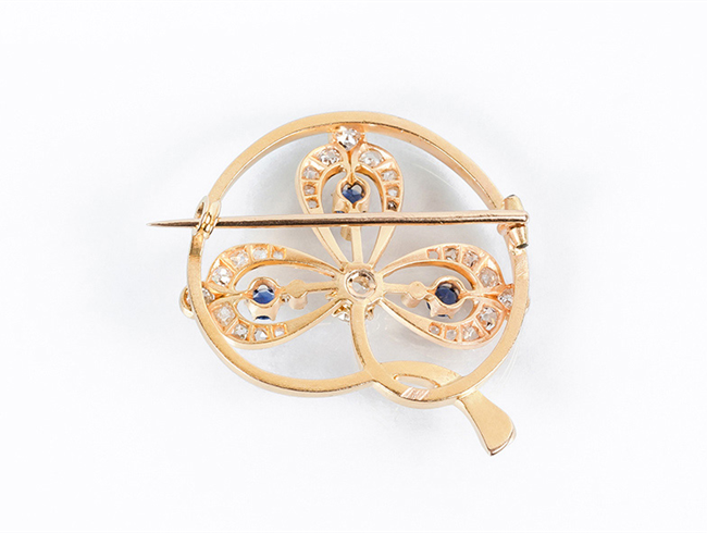 Bello alfiler de autor, época modernista, en sólida montura de oro amarillo 18 K, con motivo de trébol con un limpio y blanco diamante central, talla brillante antigua, diamantitos y zafiros azules. (1 bte: 0.25 ct, características estimadas: color G, pureza SI, y 31 dts: 0.46 ct aprox. -faltan 3-). 32 x 30 mm.