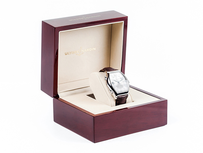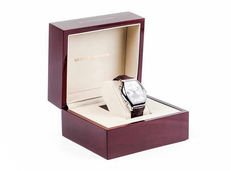 Reloj suizo caballero ULYSSE NARDIN, 'MicheLangeLo Gigante UTC', ref. 223-11, en sólida caja barrilete de acero brillo, 43-37 mm, con tapa matizada. Pulsadores de cambio de hora a la izda. Resistencia al agua: 100 metros. Movimiento automático suizo (calibre UN-22 basado en ETA 2892-A2, modificado por Ulysse Nardin). 28 rubíes. 28.800 vph. Reserva de marcha: ~42 horas. Certificado cronómetro COSC de precisión (±4 seg/día). Estanco a 100 m. Corona roscada. Esfera plateada bi-tono, matizada, con numerales romanos 'decó' plateados y agujas negras y luminiscentes. Calendario doble ventana a las dos y ventana horaria a las nueve. Brazalete de cocodrilo y hebilla originales. Excelente condición (0-1). Estado de marcha. Se acompaña de certificado de garantía (2006), manuales, estuche de madera y sobre-caja originales.