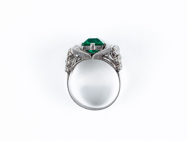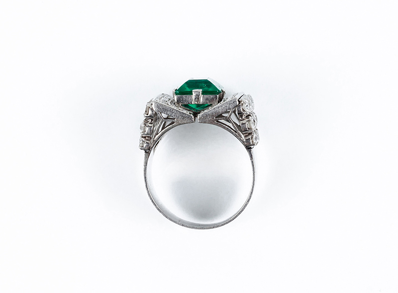 Sortija antigua en platino, estilo 'art-decó' con una piedra verde central, en su talla, orlada y flanqueada en tejadillo de limpios y blancos diamantes, talla brillante y 8/8, en garras, dispuestos en bandas (50 bts y dts: 1.90 ct aprox., características estimadas: color H, pureza VS). Nº de anillero: 12.