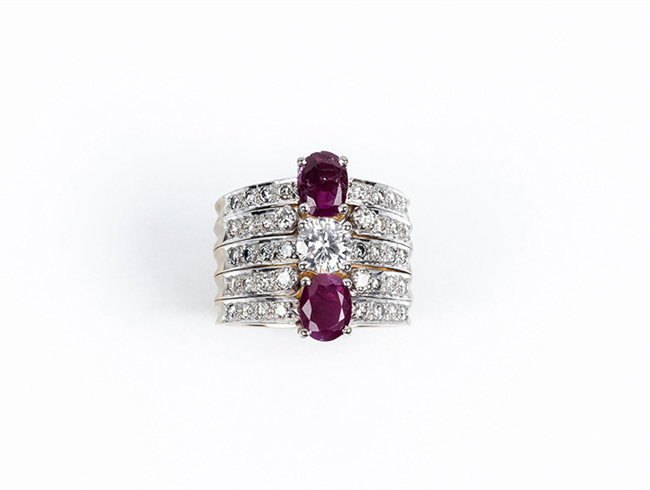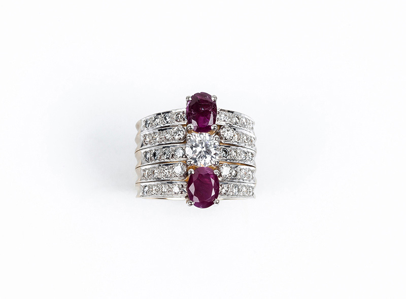 Espléndida sortija años 80, en sólida montura de oro amarillo 18 K, con un limpio y blanco diamante, talla brillante, central, flanqueado de dos rubíes finos talla oval, en garritas, sobre motivo en bandas curvas decoradas en fila de brillantitos y vistas de oro blanco (2 rub: 2.40 ct aprox.; 1 bte: 0.65 ct aprox., características estimadas: color H, pureza SI, y 40 dts: 0.60 ct aprox., características estimadas: color H, pureza VS). Nº de anillero: 16-17.