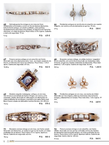 65 Delicada pulserita vintage en oro rosa con finos 66 Pendientes antiguos en zarcillo de oro amarillo con rosetón 73 Alfiler años 40, estilo ‘Chevalier’, en forma de lazada, 74 Broche ‘doble clip’ de época Chevalier, desmontable, en