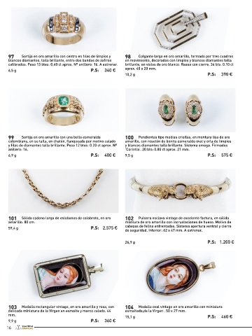 99 Sortija en oro amarillo con una bella esmeralda 100 Pendientes tipo medias criollas, en montura lisa de oro 107 Cadena cordón con colgante guardafotos vintage, en oro 108 Gargantilla en oro rosa, formada por cadenita veneciana