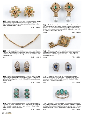 151 Pendientes en oro amarillo con fila de tres esmeraldas, 152 Sortija en montura calada de oro amarillo con centro de 159 Sortija bilabial en sólida montura calada de oro bicolor, 160 Colgante largo en oro tricolor, formado por tres perillas