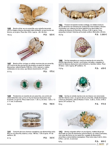 181 Sortija en oro bicolor, con motivo oval calado, decorado 182 Sortija en sólida montura de oro amarillo, con piedra 189 Pendientes en rosetón de oro amarillo, con centro de 190 Sortija en sólida montura de oro blanco con esmeralda