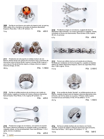 215 Pendientes largos en oro blanco, con motivo en rosetón 216 Sortija en sólida montura de oro blanco con frente 223 Alfiler-colgante de alta joyería en sólida montura de oro 224 Elegantes pendientes largos de estilo ‘decó’, en oro blanco