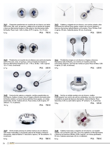 241 Elegantes pendientes en rosetón de oro blanco con bello 242 Cadena y colgante en oro blanco, con motivo calado y dos 249 Sortija ancha en sólida montura de oro blanco, con frente 250 Anillo media alianza en oro blanco con frente en pavé de