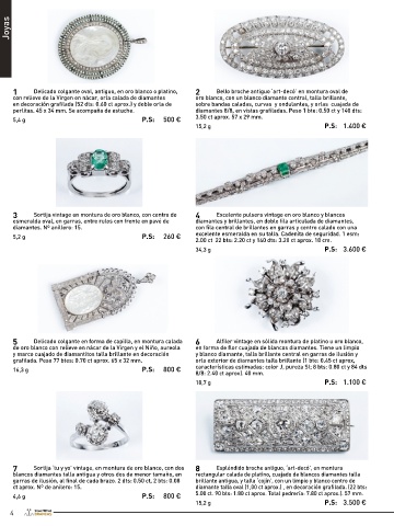 7 Sortija ‘tu y yo’ vintage, en montura de oro blanco, con dos 8 Espléndido broche antiguo, ‘art-decó’, en montura 15 Sortija vintage en montura calada de oro blanco y blancos 16 Bello alfiler antiguo, “art-decó”, en montura de platino