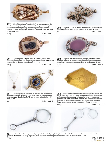 292 Dije-relicario antiguo, de estilo barroco, probablemente, s. 299 Cajita colgante antigua, oval, en oro rosa, estilo ‘decó’, 300 Colgante portaretratos oval, antiguo, en oro blanco ó