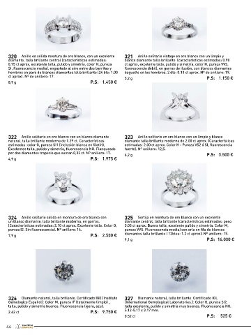 320 Anillo en sólida montura de oro blanco, con un excelente 321 Anillo solitario vintage en oro blanco con un limpio y 328 Diamante natural, talla brillante. Certificado IGI 329 Diamante natural, talla brillante. Certificado IGI
