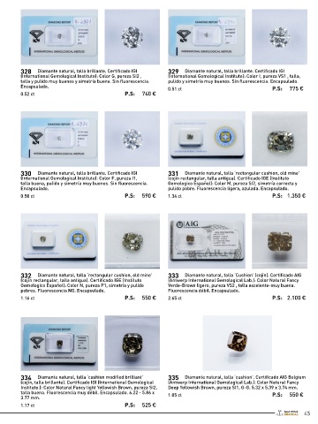 326 Diamante natural, talla brillante. Certificado IGE (Instituto 327 Diamante natural, talla brillante. Certificado IGL 334 Diamante natural, talla ‘cushion modified brilliant’ 335 Diamante natural, talla ‘cushion’. Certificado AIG Belgium