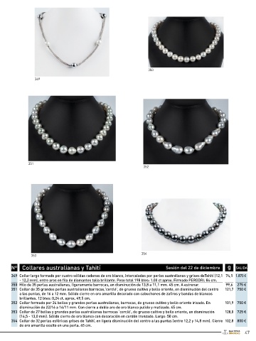 347 Delicado collar extra-largo formado por pequeñas cuentas de zafiros finos azules, montados en cadena de platino, 43,6 1.600 € 353 Collar de 27 bellas y grandes perlas australianas barrocas ‘cerclé’, de grueso cultivo y bello oriente, en disminución 128,0 725 €