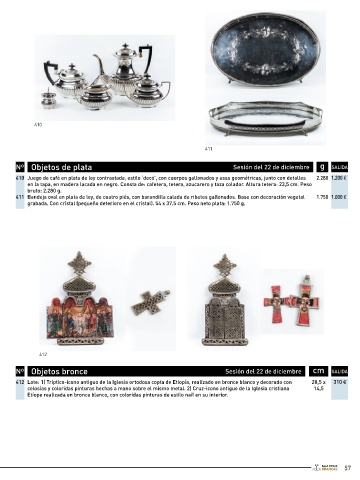 398 Moneda de oro de 8 Escudos. Carlos III. 1780. Lima. M.I. 37 mm. BC (ha estado colgada). 26,5 1.200 € 412 Lote: 1) Tríptico-icono antiguo de la Iglesia ortodoxa copta de Etiopía, realizado en bronce blanco y decorado con 28,5 x 310 €