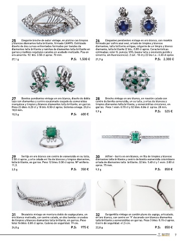 21 Bello alfiler - placa de época, “Art-Nouveau”, en montura 22 Pendientes vintage en oro blanco con perla japonesa 29 Sortija en oro blanco con centro de esmeralda en su talla, 30 Alfiler - barra en oro blanco, en fila de limpios y blancos