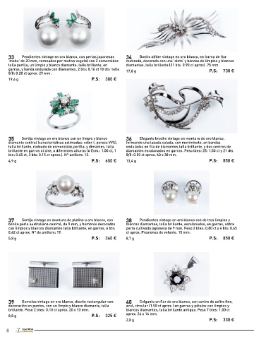 33 Pendientes vintage en oro blanco, con perlas japonesas 34 Bonito alfiler vintage en oro blanco, en forma de flor orla de limpios y blancos diamantes talla brillante, en garras blanco diamante, talla brillante, central y doble orla descendente,
