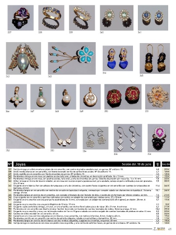 328 Sortija lanzadera vintage en oro rosa con cabuchón de coral rojo y orla en cordoncillo. Nº anillero: 16. 5,6 200 € 347 Colgante en oro amarillo con una gran perla australiana de 14 mm, coronada por un cabujón de esmeralda (0.40 ct aprox), en chatón. 28 mm. A 5,7 175 €