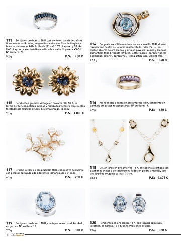 119 Sortija en oro blanco 18 K, con topacio azul oval, facetado, 120 Pendientes en oro blanco 18 K, con topacio azul oval, 18 K, diseño floral con una perlita cultivada y trébol de rubíes, en y un cabuchón oval de ojo de tigre, en chatón. Nº anillero: 14.