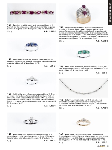 oro rosa 18 K, con esmeralda fina central, en su talla, enmarcada 152 159 Anillo solitario en sólida montura de oro blanco 18 K 160 Anillo solitario en oro amarillo 18 K, con un limpio y