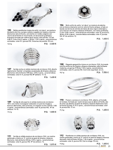 181 Bellos pendientes largos de estilo ‘art-decó’, en montura de blancos diamantes 8/8, con vistas grafiladas (Zaf: 0,85 ct, 1 bte: 0.37 189 Sortija de alta joyería en sólida montura de oro blanco en la base, formada por cuatro brazos que se abren al frente, dos