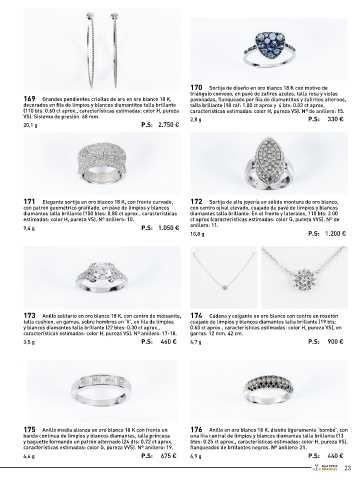167 Anillo solitario en sólida montura de oro blanco y 168 Pendientes medias criollas, en oro bicolor 18 K, con frente 175 Anillo media alianza en oro blanco 18 K con frente en 176 Anillo en oro blanco 18 K, diseño ligeramente ‘bombé’, con
