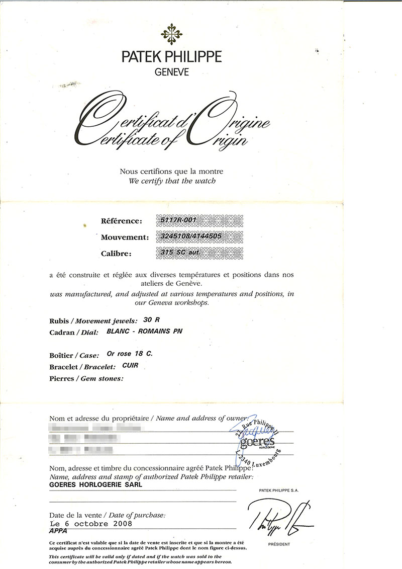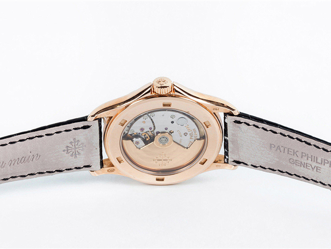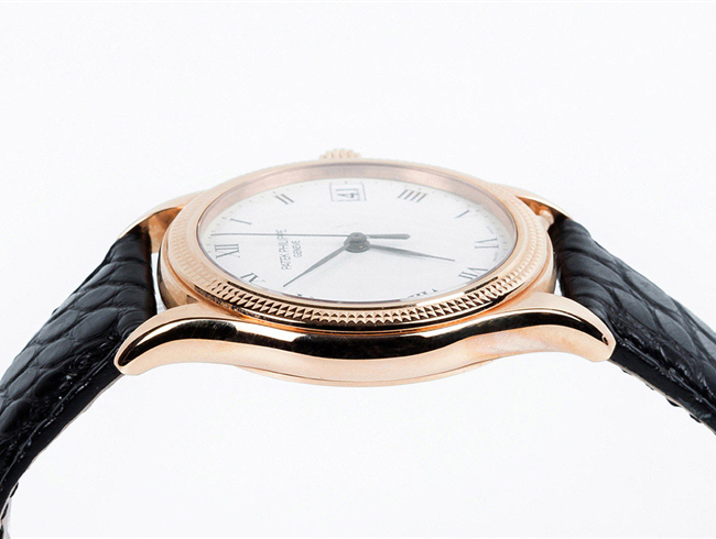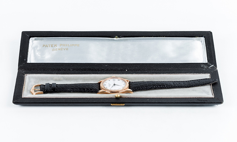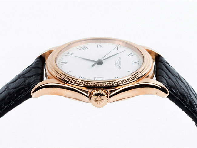 Reloj cab., suizo, PATEK PHILIPPE Calatrava, Ref 5117R-001. Sólida caja 37 mm en oro rosa 18 K con bisel ajedrezado "Clous de Paris" y cristal zafiro en anverso y reverso. Corona roscada. Esfera blanca con numerales romanos y agujas negras, segundero central. Calendario a las tres. Movimiento automático (calibre 315/190 SC aut). 30 rubíes, masa oscilante en oro amarillo 18 K decorada con el logo del modelo, ajustado a temperaturas y posiciones. Brazalete de cocodrilo negro y hebilla en oro rosa 18 K, originales. Impecable (0). Se acompaña Certificado de origen (2008). Estado de marcha. Se acompaña de un estuche Patek (de época anterior).