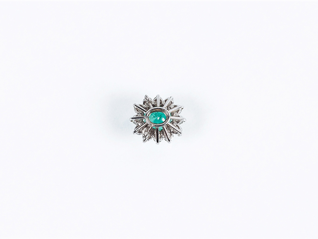Colgante en oro blanco 18 K con una bellísima esmeralda colombiana, en su talla, orlada de limpios y blancos diamantes, talla brillante en garritas (1 Esm; 1.00 ct aprox, 12 bts: 0.50 ct aprox, características estimadas: color H, pureza VS). 12 x 10 mm.