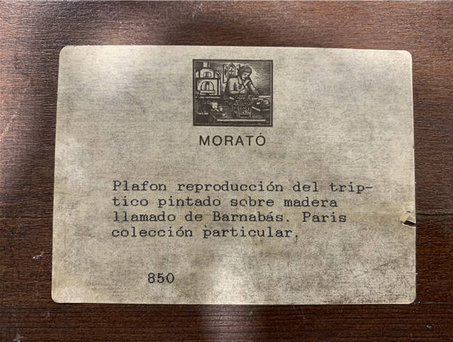 Tríptico neo-gótico de gran formato, enmarcado, con imágenes de la Virgen con el niño flanqueada de San Juan Evangelista y San Pedro, con una bella decoración de relieves esmaltados. Apliques de esmaltes y piedras de color, con fondo de tela. Artesano Morató. [Plafón reproducción del Tríptico pintado sobre madera, llamado de Barnabás. Paris. Colección particular]
