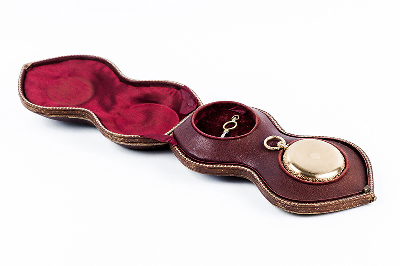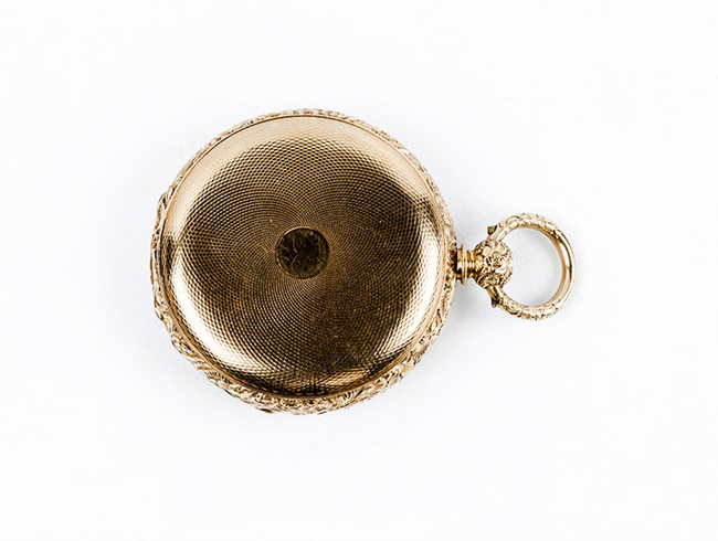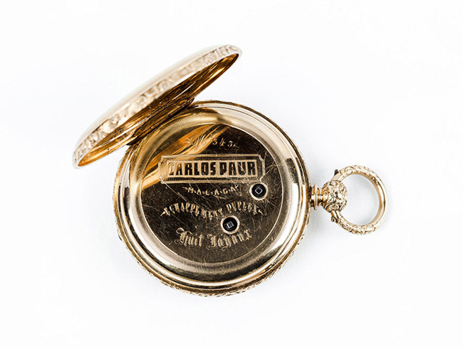 Excelente reloj saboneta de bolsillo, suizo, Nº 343, fabricado para el detallista de Málaga CARLOS PAUR. Caja, 49 mm, de tres sólidad tapas en oro amarillo 18 K, contrastadas y numeradas, en decoración guilloché las exteriores, la guardapolvos con las características del excelente movimiento: Escape DUPLEX, 8 rubíes. Canto y borde de las tapas conforman una guirnalda floral. Bella esfera de oro con numerales romanos y detalles vegetales en oro rosa y blanco, y agujas 'espada' en acero azul. Segundero central. Máquina profusamente decorada, puentes grabados y cincelados con guirnaldas florales, volante bi-metal compensado. Remontaje a llave. Estado de marcha. Excelente condición (0-1). C. 1.880. Se acompaña de su estuche de piel y seda, con su llave y un cristal de recambio original. [CARLOS PAUR fue un detallista de lujo en Málaga, activo entre 1850-1890. Su tienda en la Calle Nueva del centro histórico era famosa por importar relojes suizos y franceses de calidad para clientes adine