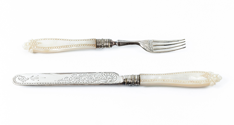 Bello juego vintage de doce cuchillos y tenedores en plata inglesa contrastada (Sheffield, 1873), con decoración floral grabada y asas de nácar. Se presenta en caja original de madera (deteriorada). 16,5 y 20,5 cm.