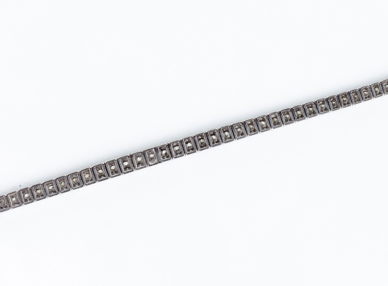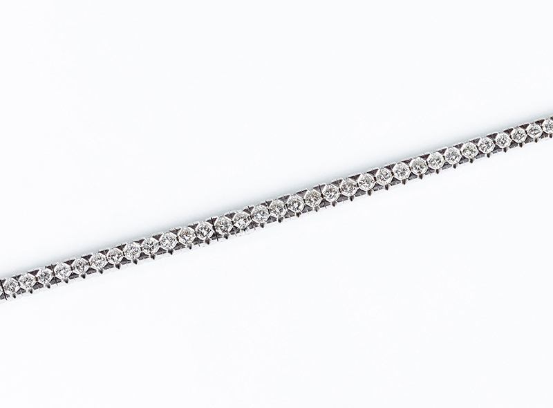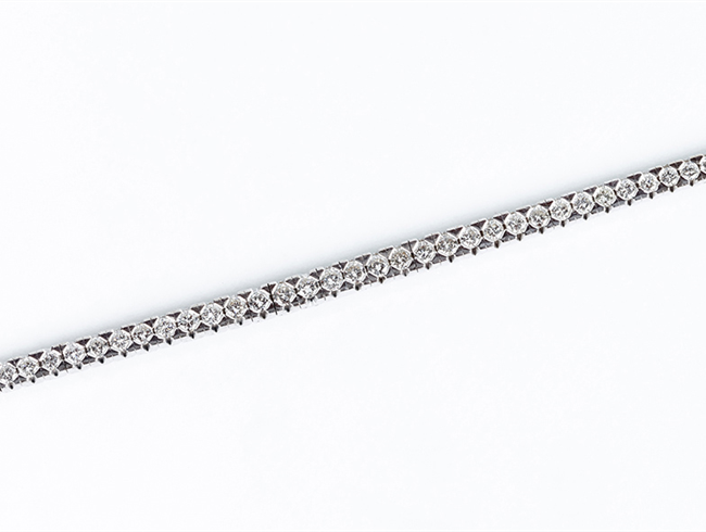 Brazalete riviere en sólida montura de oro blanco 18 K, con motivo articulado en fila de limpios y blancos diamantes, talla brillante en garras (58 bts: 2.00 ct aprox., características estimadas: color G, pureza VS). Cierre con dos posiciones y sistema de seguridad. 20,5-21,0 cm.