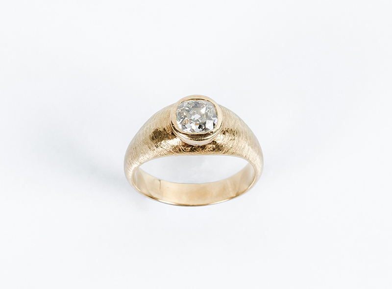 Anillo solitario vintage en sólida montura matizada de oro amarillo 18 K, con un limpio y blanco diamante natural, talla 'cushion', en chatón (1 dte: 1.75 ct aprox., características estimadas: color I, pureza VVS, fluorescencia media, azul). Anillero nº 23.